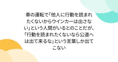 車の運転で「他人に行動を読まれたくないからウインカーは出さない」という人間がいるとのことだが、「行動を読まれたくないなら公道へは出て来るな」という言葉しか出てこない