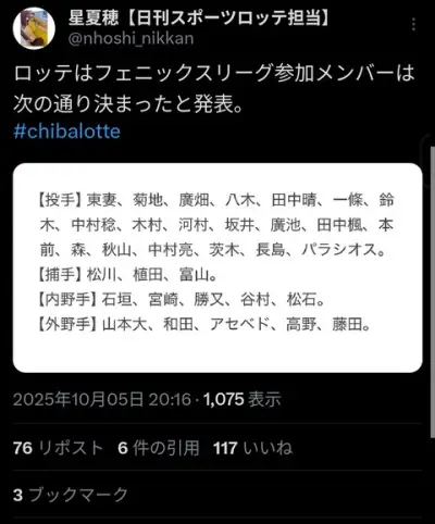 ロッテ、フェニックスリーグ参加メンバー発表!投手20名・野手13名