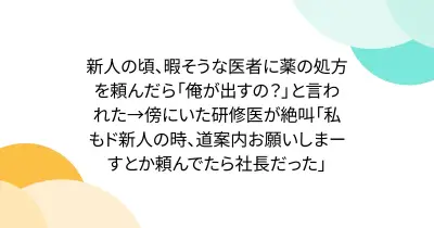 新人の頃、暇そうな医者に薬の処方を頼んだら「俺が出すの?」と言われた→傍にいた研修医が絶叫「私もド新人の時、道案内お願いしまーすとか頼んでたら社長だった」