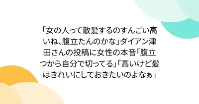 「女の人って散髪するのすんごい高いね、腹立たんのかな」ダイアン津田さんの投稿に女性の本音「腹立つから自分で切ってる」「高いけど髪はきれいにしておきたいのよなぁ」