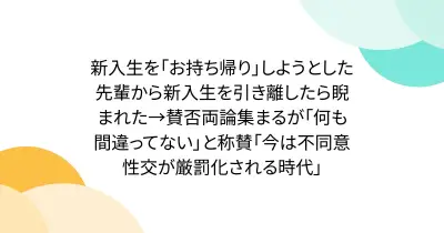新入生を「お持ち帰り」しようとした先輩から新入生を引き離したら睨まれた→賛否両論集まるが「何も間違ってない」と称賛「今は不同意性交が厳罰化される時代」