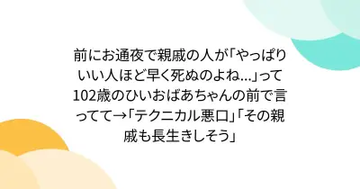 前にお通夜で親戚の人が「やっぱりいい人ほど早く死ぬのよね...」って102歳のひいおばあちゃんの前で言ってて→「テクニカル悪口」「その親戚も長生きしそう」
