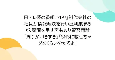 日テレ系の番組『ZIP!』制作会社の社員が情報漏洩を行い批判集まるが、疑問を呈す声もあり賛否両論「周りが叩きすぎ」「SNSに載せちゃダメくらい分かるよ」