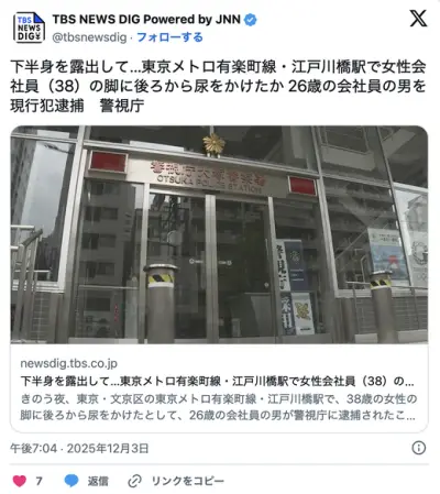 【警視庁】下半身を露出して…東京メトロ江戸川橋駅で女性会社員(38)の脚に後ろから尿をかけたか 26歳の会社員の男を現行犯逮捕