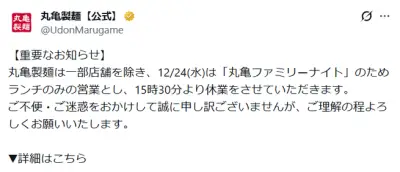 丸亀製麺、12/24は15時半で閉店「家族で過ごしてほしいため」