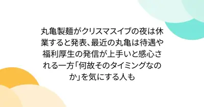 丸亀製麺がクリスマスイブの夜は休業すると発表、最近の丸亀は待遇や福利厚生の発信が上手いと感心される一方「何故そのタイミングなのか」を気にする人も