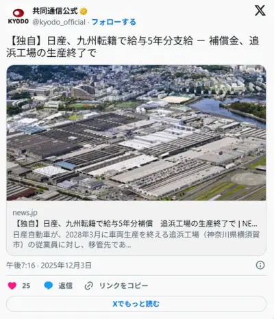 日産「追浜工場の皆さん、九州に引っ越してくれたら給料5年分あげます」