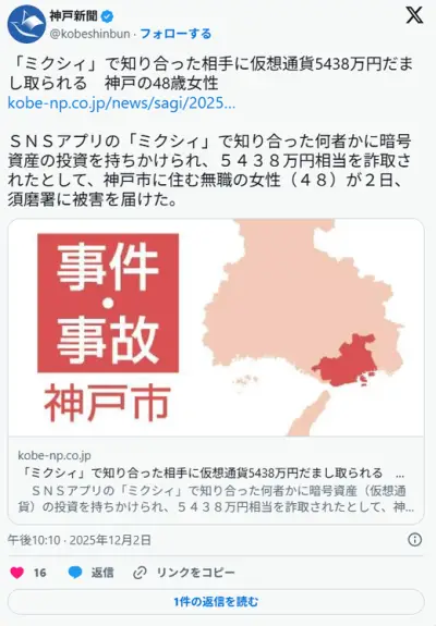 「ミクシィ」で知り合った相手に仮想通貨5438万円だまし取られる 神戸の48歳女性