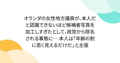 オランダの女性地方議員が、本人だと認識できないほど候補者写真を加工しすぎたとして、政党から除名される事態に… 本人は「年齢の割に若く見えるだけだ」と主張