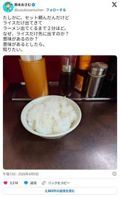 鈴木おさむ氏、ラーメン店でモヤッ…「なぜ先にライスを出す?意味があるのか?」投稿に「分かります」「店側としては…」