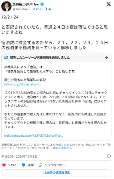 ビットフライヤーCEO 「12/21-24と表記されていたら、普通24日の夜は宿泊できると思いますよね?」