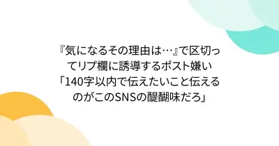 『気になるその理由は…』で区切ってリプ欄に誘導するポスト嫌い「140字以内で伝えたいこと伝えるのがこのSNSの醍醐味だろ」