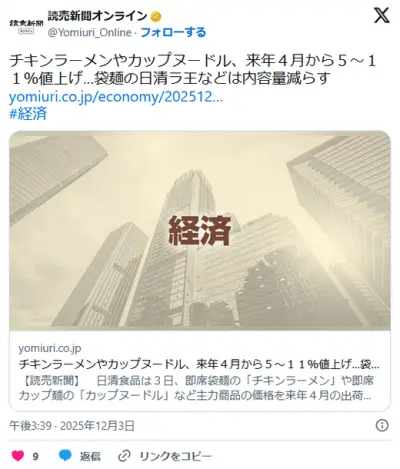 チキンラーメンやカップヌードル、来年4月から5-11%値上げ…袋麺の日清ラ王などは内容量減らす