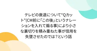 テレビの衰退について“Qカット”(CM前に「この後」というナレーションを入れて煽る事)により小さな裏切りを積み重ねた事が信用を失墜させたのでは?という話