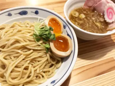 つけ麺の汁を右に置いて配膳するラーメン屋