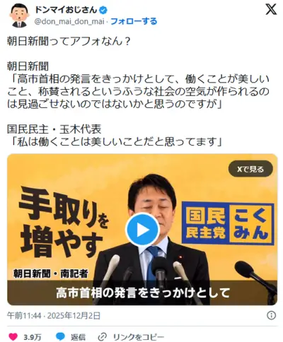 朝日「首相が「働くことは美しい」なんて抜かしてる!」 国民民・玉木氏「働くことは美しいですよね」