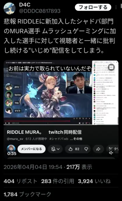 【悲報】シャドバのプロゲーマー、加藤純一のゲーミングチームを嘲笑。批判コメントに逆ギレし、オタクまで煽って炎上秒読みか