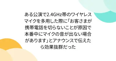 ある公演で2.4GHz帯のワイヤレスマイクを多用した際に「お客さまが携帯電話を切らないことが原因で本番中にマイクの音が出ない場合があります」とアナウンスで伝えたら効果抜群だった