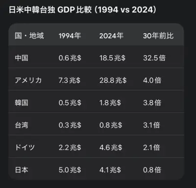 📊過去30年間の日米中韓台独のGDP増加率📊