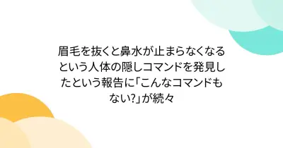 眉毛を抜くと鼻水が止まらなくなるという人体の隠しコマンドを発見したという報告に「こんなコマンドもない?」が続々