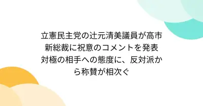 立憲民主党の辻󠄀元清美議員が高市新総裁に祝意のコメントを発表 対極の相手への態度に、反対派から称賛が相次ぐ