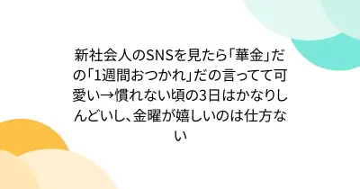 新社会人のSNSを見たら「華金」だの「1週間おつかれ」だの言ってて可愛い→慣れない頃の3日はかなりしんどいし、金曜が嬉しいのは仕方ない