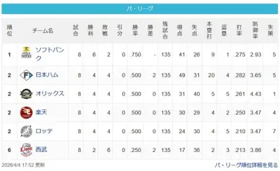 【4/4】パ・リーグ順位表|借金完済🔥…日ハムの現在順位がこちら