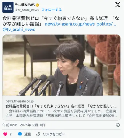 【悲報】高市早苗「食料品消費減税はできない。物価は徐々に落ち着くと思う。」