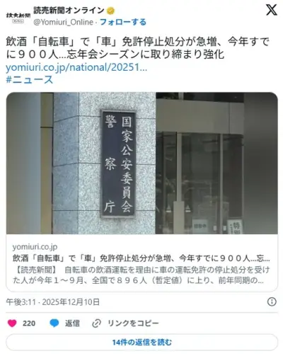 飲酒「自転車」で「車」免許停止処分が急増、今年すでに900人…忘年会シーズンに取り締まり強化