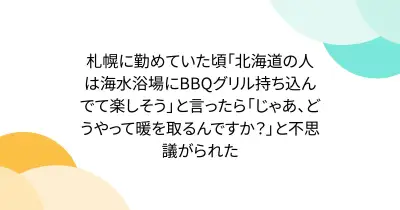 札幌に勤めていた頃「北海道の人は海水浴場にBBQグリル持ち込んでて楽しそう」と言ったら「じゃあ、どうやって暖を取るんですか?」と不思議がられた