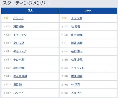【巨人対DeNA2回戦】1(二) 浦田 俊輔 4(三) ダルベック 7(中) 佐々木 俊輔 8(一) 増田 陸
