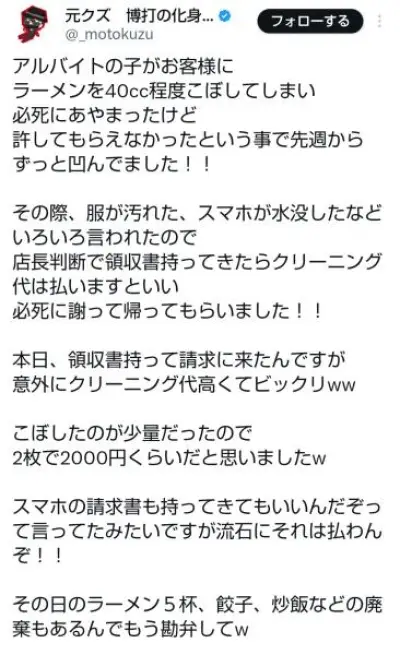 ラーメン屋さん、お客さんにスープをこぼしただけで数万円請求されてしまう