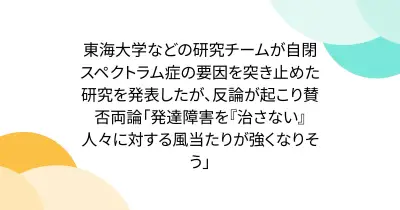 東海大学などの研究チームが自閉スペクトラム症の要因を突き止めた研究を発表したが、反論が起こり賛否両論「発達障害を『治さない』人々に対する風当たりが強くなりそう」