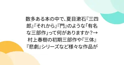 数多ある本の中で、夏目漱石『三四郎』『それから』『門』のような「有名な三部作」って何がありますか?→村上春樹の初期三部作や『三体』『悲劇』シリーズなど様々な作品が
