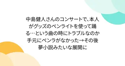 中島健人さんのコンサートで、本人がグッズのペンライトを使って踊る…という曲の時にトラブルなのか手元にペンラがなかった→その後夢小説みたいな展開に