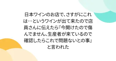 日本ワインのお店で、さすがにこれは…というワインが出て来たので店員さんに伝えたら『今開けたので傷んでません、生産者が来ているので確認したらこれで問題ないとの事』と言われた