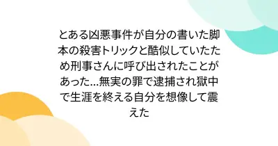 とある凶悪事件が自分の書いた脚本の殺害トリックと酷似していたため刑事さんに呼び出されたことがあった...無実の罪で逮捕され獄中で生涯を終える自分を想像して震えた