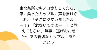 東北某所でキノコ漁りしてたら、車に乗ったカップルに声を掛けられ、「そこにクマいましたよー!」「危ないですよー!」と教えてもらい、無事に逃げおおせた… あの親切なカップル、ありがとう
