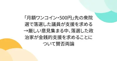 「月額ワンコイン・500円」先の衆院選で落選した議員が支援を求める→厳しい意見集まる中、落選した政治家が金銭的支援を求めることについて賛否両論