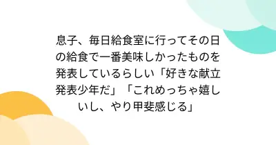息子、毎日給食室に行ってその日の給食で一番美味しかったものを発表しているらしい「好きな献立発表少年だ」「これめっちゃ嬉しいし、やり甲斐感じる」