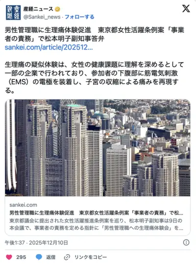 東京都の女性活躍推進条例案に「男性管理職への生理痛体験会」を盛り込む