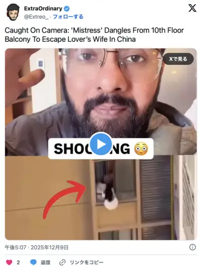 中国で愛人の妻から逃れるため、10階のバルコニーからぶら下がる「愛人」をカメラが捉える