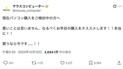 「買うなら今です……!!」マウスコンピューター公式がパソコン購入を検討中の人に向けて投稿→メモリ高騰でどこのPCメーカーも値上げ寸前?