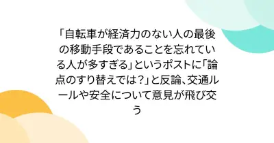 「自転車が経済力のない人の最後の移動手段であることを忘れている人が多すぎる」というポストに「論点のすり替えでは?」と反論、交通ルールや安全について意見が飛び交う