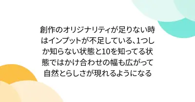 創作のオリジナリティが足りない時はインプットが不足している、1つしか知らない状態と10を知ってる状態ではかけ合わせの幅も広がって自然とらしさが現れるようになる
