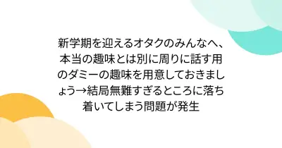 新学期を迎えるオタクのみんなへ、本当の趣味とは別に周りに話す用のダミーの趣味を用意しておきましょう→結局無難すぎるところに落ち着いてしまう問題が発生