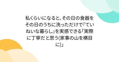 私くらいになると、その日の食器をその日のうちに洗っただけで『ていねいな暮らし』を実感できる「実際に丁寧だと思う(家事の山を横目に)」