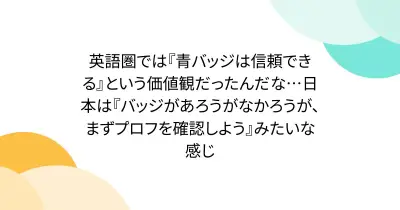 英語圏では『青バッジは信頼できる』という価値観だったんだな…日本は『バッジがあろうがなかろうが、まずプロフを確認しよう』みたいな感じ