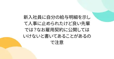 新入社員に自分の給与明細を示して人事に止められたけど良い先輩では?なお雇用契約に公開してはいけないと書いてあることがあるので注意
