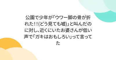 公園で少年が「ウワー脚の骨が折れた!!(どう見ても嘘)」と叫んだのに対し、近くにいたお婆さんが低い声で「ガキはおもしろい」って言ってた